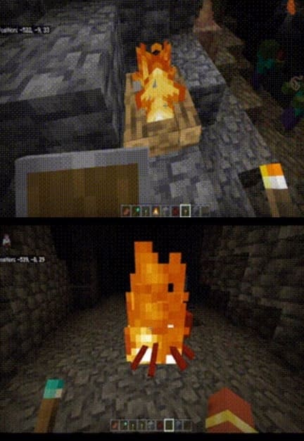 Sólo tienes que tomar una antorcha en sus manos y golpear a una turba o una hoguera para prenderle fuego en Minecraft PE (Bedrock).