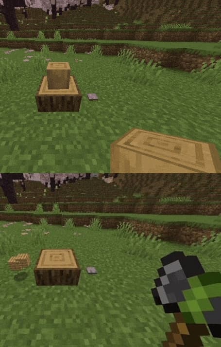 Ahora para hacer una tabla necesitas una plataforma de madera, coloca la madera pelada sobre ella y córtala con un hacha. Y entonces obtendrás las tablas. Es como en la vida real.