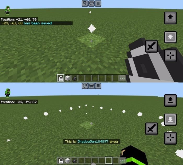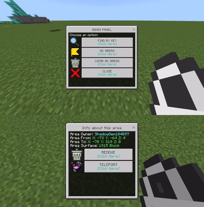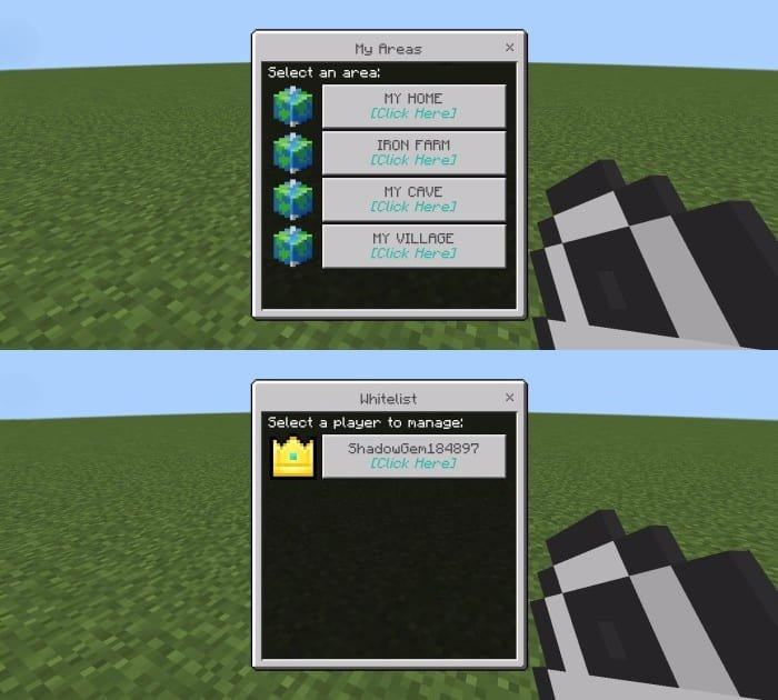 En los límites establecidos de la casa con este mod para Minecraft PE (Bedrock), otros jugadores no podrán interactuar y utilizar explosivos en su zona. El jugador puede gestionar sus regiones con la ayuda de claves, y los administradores del mundo o servidor - con un panel de administración especial. Además, los límites establecidos de la "privat" se mostrará cuando se mueve a ellos, y para el propietario de la base - siempre se muestra. Usted puede agregar a la zona, por ejemplo, sus amigos para la gestión conjunta de la casa.