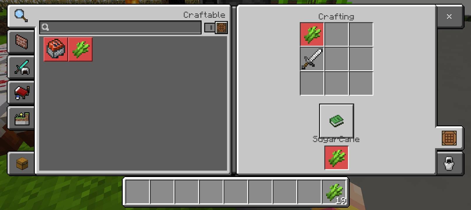 Normalmente, la caña de azúcar solo se utiliza para fabricar papel o azúcar; sin embargo, el mod «Eatable SugarCane» ofrece un uso mucho más práctico para esta planta. Ahora se puede convertir en un alimento completo y utilizarla para saciar rápidamente el hambre durante la supervivencia. Para crear la versión comestible, hay que combinar la caña de azúcar normal con una espada de hierro en el banco de trabajo.