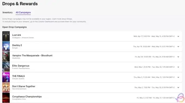 Cuando hayas iniciado sesión en Twitch, haz clic en la imagen de perfil de la esquina derecha. Ahora selecciona el botón Gotas y recompensas. Aquí podrás ver tu inventario y todas las campañas.