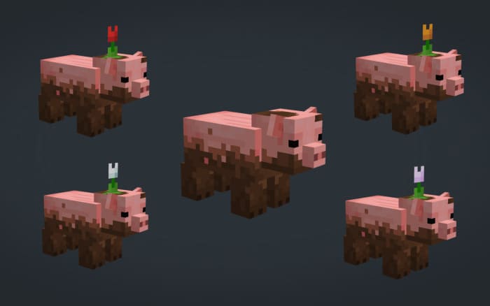 El resurspack Barely Default Pigs mejorará los cerdos en Minecraft PE (Bedrock) añadiendo diferentes elementos 3D en las texturas. Además, se añadirán al juego varias variantes de cerdos: sucios, jabalíes, con flores.