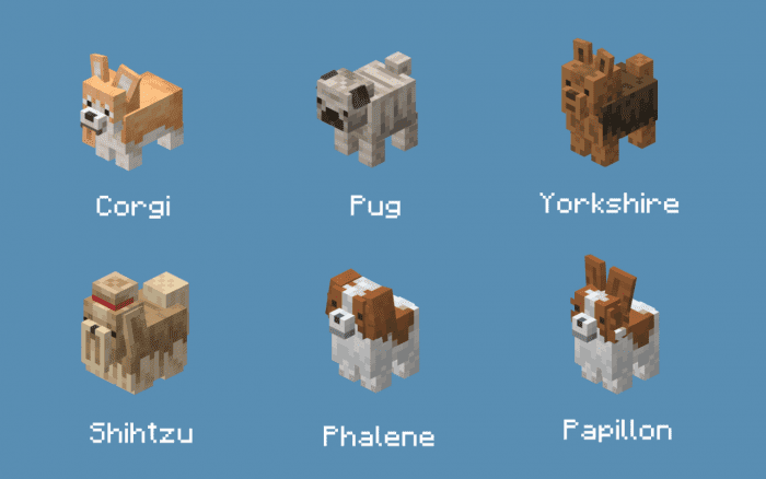 A los amantes de las mascotas domesticadas en Minecraft PE a menudo les falta variedad, y The Doggos resuelve este problema con creces. Este paquete de texturas añade toda una colección de nuevos aspectos para los perros, gracias a lo cual las mascotas dejan de tener el mismo aspecto. En total hay 37 texturas disponibles para perros domesticados, incluyendo 29 razas que se pueden desbloquear mediante etiquetas con nombres únicos.